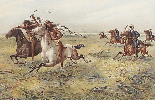【インディアン戦争(インディアンを追撃するアメリカ騎兵の想像図)/1622年-1890年、米国とカナダの白人入植者とインディアンの間で起きた戦争の本質は、ジェノサイドだった(ウィキ)】 |