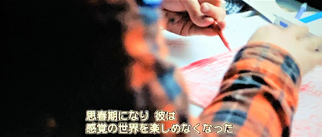 「僕は世界をどう見ているのか。見えるものは、みんなと同じでも、それをどう受け取るかが違う。みんなは物を見る時、まず全体を見てから、部分を見ている思う。僕の場合は、まず部分が飛び込んでくる。その後、視界が広がって全体が分かるんだ。僕の目は線や面などにとらわれる。状況を理解するには、記憶の中から最も似た場面を探す必要がある」(モノローグ)