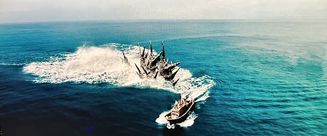 機雷除去の作業に向かう新生丸と海進丸の前に、大破された輸送船が傾いて浮かんでいる。